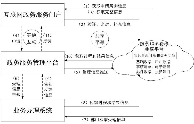 网上政务服务平台主要由互联网政务服务门户、政务服务管理平台、业务办理系统和政务服务数据共享平台等四部分构成。平台各组成部分之间实现数据互联互通,各组成部分之间的业务流、信息流如下图所示: